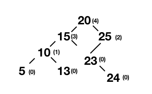 각 노드의 옆에 있는 작은 숫자는 왼쪽 노드의 갯수이다. 루트 20과 24를 비교해보면 24는 오른쪽에 있어야 하기때문에 20의 왼쪽 노드의 갯수인 4 + 1 (20을 포함) = counter은 5개가 된다. 그다음, 25와 비교해보자 24는 25의 왼쪽에 잇어야하므로 갱신하지 않는다.